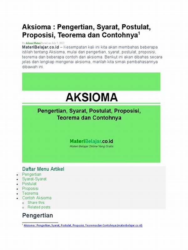 Dengan demikian, pengenalan dan penerapan aksioma tidak hanya sebuah latihan intelektual semata. Ini adalah sebuah komitmen untuk mengaplikasikan nilai-nilai inti yang menghasilkan stabilitas dan keberlanjutan baik dalam kehidupan pribadi maupun profesional. Manfaat nyata aksioma bisa sejauh bagaimana kita menggunakannya sebagai pedoman dan inspirasi dalam aksi sehari-hari. Dengan dibekali pemahaman ini, mari kita lanjutkan perjalanan kita, menggali lebih dalam keajaiban dan manfaat yang dapat ditawarkan oleh dunia aksioma.