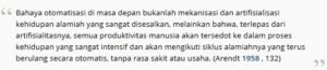 Arendt mengkarakterisasikan cita-cita utopis tentang otomatisasi penuh sebagai sesuatu yang pada hakikatnya bermusuhan dengan keduniawian karena cita-cita ini merepresentasikan versi yang diperluas dari proses metabolisme kerja dan konsumsi, perbedaannya adalah bahwa sekarang orang-orang dibebaskan untuk “mengonsumsi seluruh dunia dan mereproduksi setiap hari semua hal yang ingin dikonsumsinya” (Arendt 1958 ). Namun, kritik ini hanya masuk akal sejauh hubungan antara produksi dan konsumsi tetap tidak dimediasi secara politis. Artinya, Arendt mengandaikan dalam kritiknya bahwa otomatisasi produksi tidak disertai dengan bentuk kontrol politik yang berbeda atau lebih besar atas produksi ini, itulah sebabnya ia menyamakan pencapaian seperti itu dengan cita-cita “masyarakat konsumen,” di mana “kita tidak akan lagi hidup di dunia sama sekali tetapi hanya didorong oleh suatu proses di mana siklus yang terus berulang di mana segala sesuatu muncul dan menghilang, memanifestasikan diri mereka sendiri dan lenyap” (Arendt 1958 , 134).