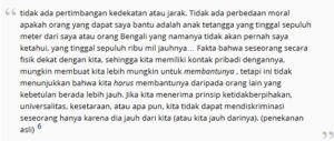 Dalam esainya yang provokatif dan berpengaruh, “Kelaparan, Kemakmuran, dan Moralitas,” penganut paham utilitarianisme Peter Singer membantu mengilustrasikan beberapa komponen inti dari pandangan kosmopolitan dengan skenario sederhana: Singer mempertimbangkan seorang individu (yang akan saya sebut sebagai Peter) yang berjalan di samping sebuah kolam dangkal dan melihat seorang anak tenggelam di dalamnya.5 Dengan asumsi bahwa Peter dapat menyelamatkan anak itu dengan aman, dan hanya menanggung beban yang “secara moral tidak penting” (misalnya, ketidaknyamanan, kehilangan waktu, dan pakaian berlumpur), Peter memiliki kewajiban moral untuk menyelamatkan anak itu. Singer kemudian berpendapat bahwa kewajiban moral yang serupa mengharuskan orang-orang yang relatif kaya untuk memberikan bantuan “penyelamatan” kepada orang-orang yang terancam di negara-negara miskin. Mengikuti posisi kosmopolitan, Singer berpendapat bahwa geografi dan kebangsaan adalah pertimbangan yang tidak relevan secara moral. Singer menyatakan bahwa prinsip yang mendorong kewajiban moral untuk menyelamatkan adalah: