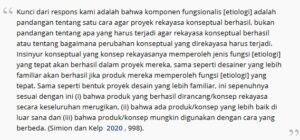 Dalam pandangan mereka, tujuan ini lebih baik dicapai dengan berfokus pada fungsi etiologi, yang menjelaskan keberadaan beberapa sifat—seperti jantung—melalui fungsi yang dimainkannya—untuk memompa darah—pada agen yang memilikinya, dan kontribusi yang dimilikinya, dari waktu ke waktu, terhadap kelangsungan hidup mereka yang menunjukkan sifat tersebut (lihat Wright 1973 , Millikan 1984 , Neander 1991 , dan Godfrey-Smith 1994 ). Simion dan Kelp memperluas konsepsi etiologi fungsi ke konsep. Mereka berpendapat bahwa sebagai tambahan terhadap fungsi etiologi, konsep memperlihatkan fungsi yang dirancang—yaitu, fungsi yang awalnya dirancang untuk diwujudkan. Yang krusial bagi pandangan mereka adalah identifikasi kriteria keberhasilan yang sesuai, yang menurutnya fungsi yang dirancang pada akhirnya harus diubah menjadi jenis fungsi etiologi yang sesuai (Simion dan Kelp 2020 , 990). Artinya, setelah konsep dirancang dan dilemparkan ke pasar konsep yang kejam, jika semuanya berjalan sesuai rencana, konsep tersebut “akan digunakan untuk melakukan apa yang dirancang untuk dilakukan, dan akan terus digunakan berdasarkan fakta bahwa cara berpikir tentang dunia yang disediakannya bermanfaat bagi pengguna” (Simion dan Kelp 2020 , 990). Hasilnya, kriteria keberhasilan yang jelas kemudian dapat diartikulasikan: “[S]ujuan yang masuk akal dari para insinyur konseptual adalah agar fungsi-d [yaitu, fungsi yang dirancang] yang mereka kembangkan berubah menjadi jenis fungsi-e [yaitu, fungsi etiologi] yang baru saja dijelaskan” (Simion dan Kelp 2020 , 990). Artinya, jika fungsi yang dirancang diubah menjadi fungsi etiologi, konsep akan terus digunakan karena manfaat yang dibawanya bagi mereka yang menggunakannya.