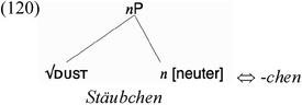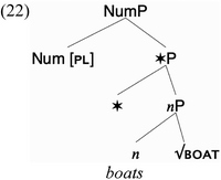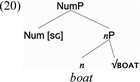 Untuk membingkai diskusi kita tentang sintaksis dan semantik frasa kata benda, kita mulai dengan struktur dalam (20), frasa angka (NumP) yang kepalanya mencakup fitur angka sg yang ditemukan pada kata benda tunggal. Kepala NumP dikombinasikan dengan kata benda perahu yang terdiri dari akardan kepala nominalisasi n 8 :