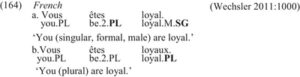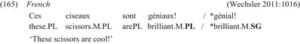 Bahasa Indonesia: Di bagian ini, kami membahas tiga kasus kesepakatan semantik dengan kata sifat predikatif. Dalam kesepakatan semantik, bentuk target dipengaruhi oleh makna pengendali. Pengendali dalam tiga kasus ini mencakup kata ganti orang kedua jamak Prancis yang sopan vous , jamak leksikal ciseaux ‘gunting’, dan kata benda netral Asturia carbón ‘batu bara’. Studi-studi ini mengonfirmasi aspek-aspek analisis kami tentang jamak leksikal dalam hal multipartisipan. Contoh-contoh Asturia mengonfirmasi bahwa ada hal seperti makna yang dapat dimiliki oleh fitur infleksi yang membuatnya kompatibel dengan akar kata benda massal tetapi tidak dengan akar kata benda hitung. Contoh-contoh Prancis mengonfirmasi bahwa ekspresi yang menunjukkan jamak dan jamak massal berada dalam kategori makna yang sama sehubungan dengan kesepakatan jumlah. Eksperimen durasi mengonfirmasi bahwa jamak massal memiliki fitur dengan eksponen yang sama dengan fitur jumlah yang ditemukan pada jamak hitung.